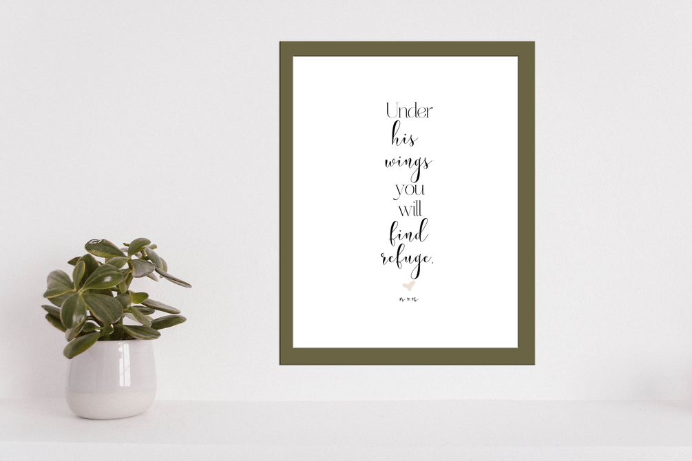 "Under his wings you will find refuge," Psalm 91:4b. Downloadable file, ready to print in sizes 8x10- 11x14.